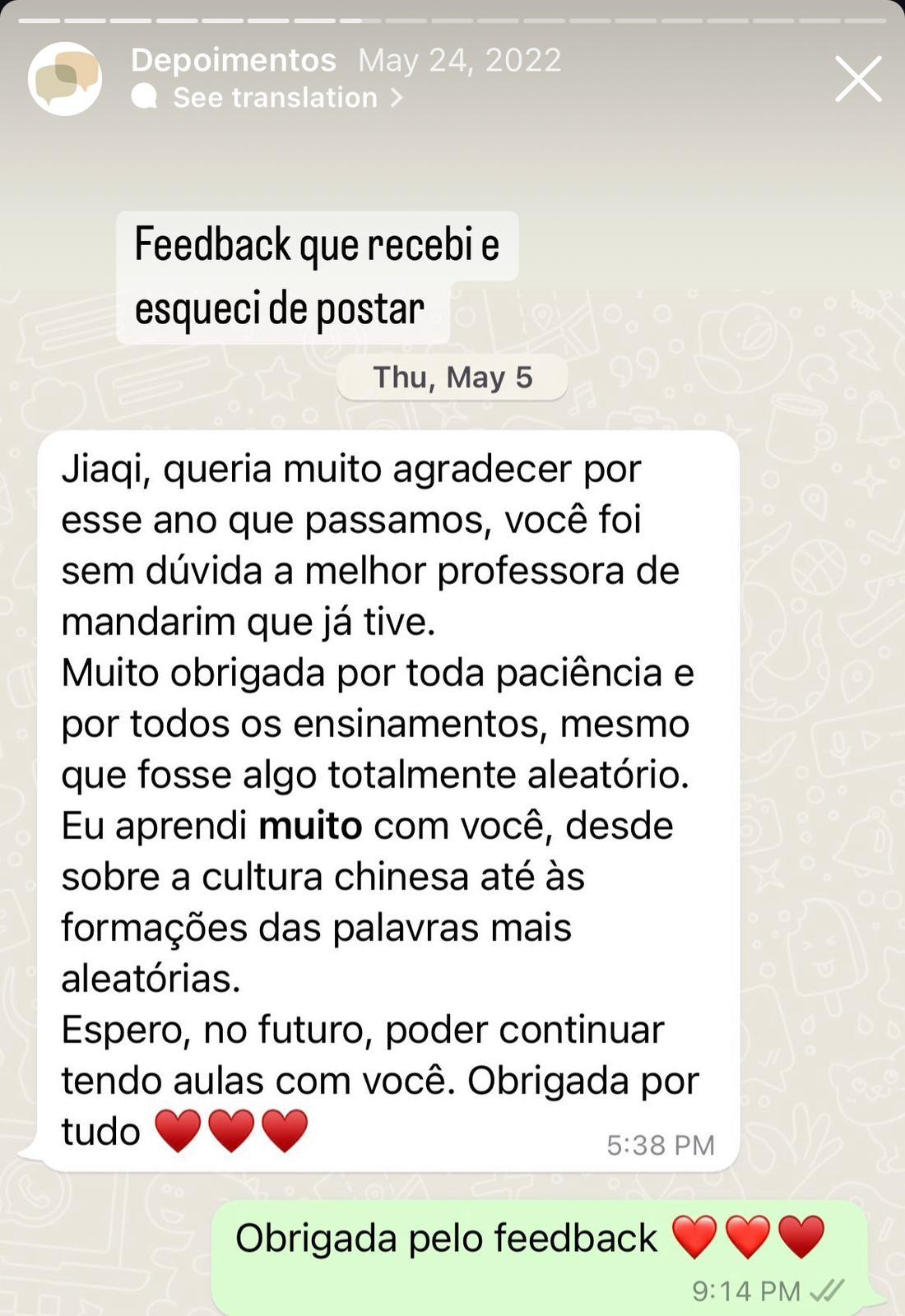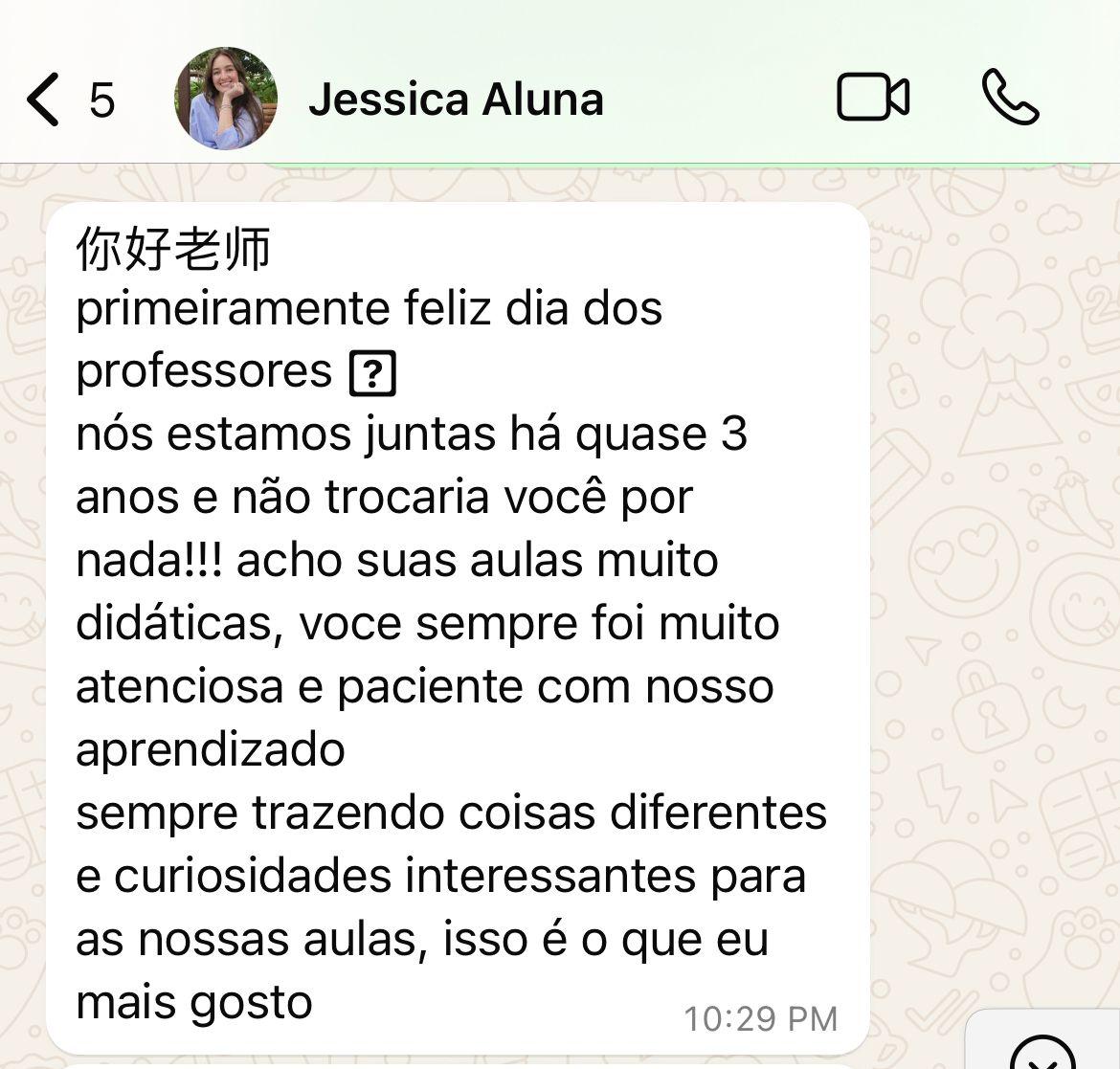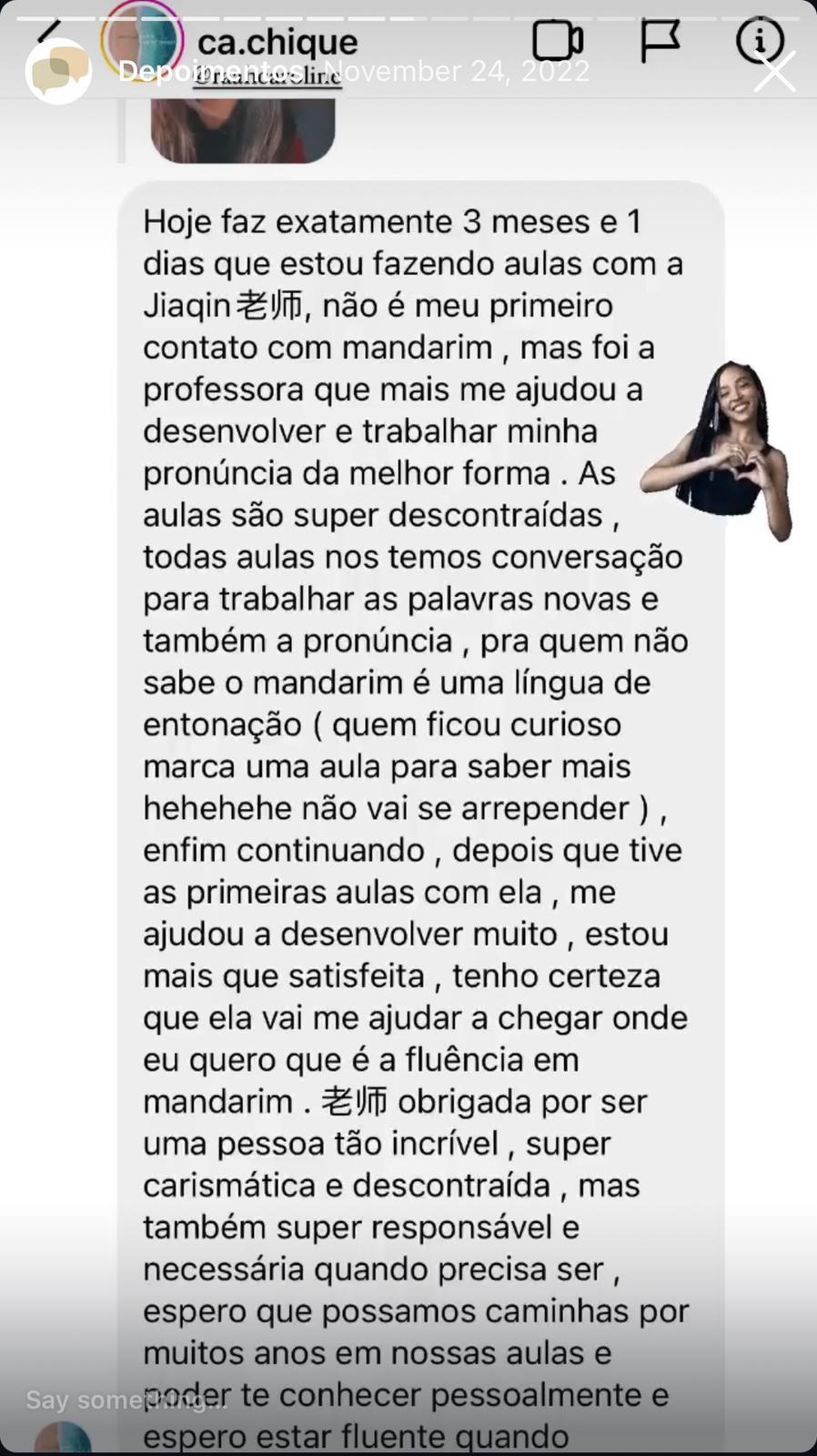 Apaixonada por Conectar Pessoas: Jiaqi acredita que o idioma é uma ferramenta poderosa para criar laços e oportunidades, ajudando seus alunos a realizarem seus sonhos.